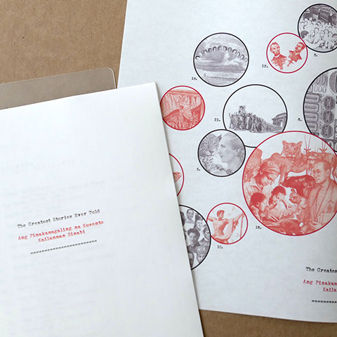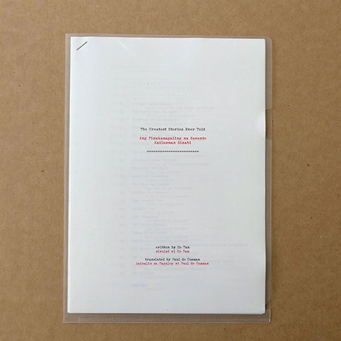 Inspired by de Guzman's line-by-line translated text, the Tagalog edition resembles an old-time document from a typewriter with black and red ink ribbons. The English text is in black types while Tagalog is in red. Besides the typewritten document, it has an appendix which illustrates all the stories. All the documents are contained in a clear folder.